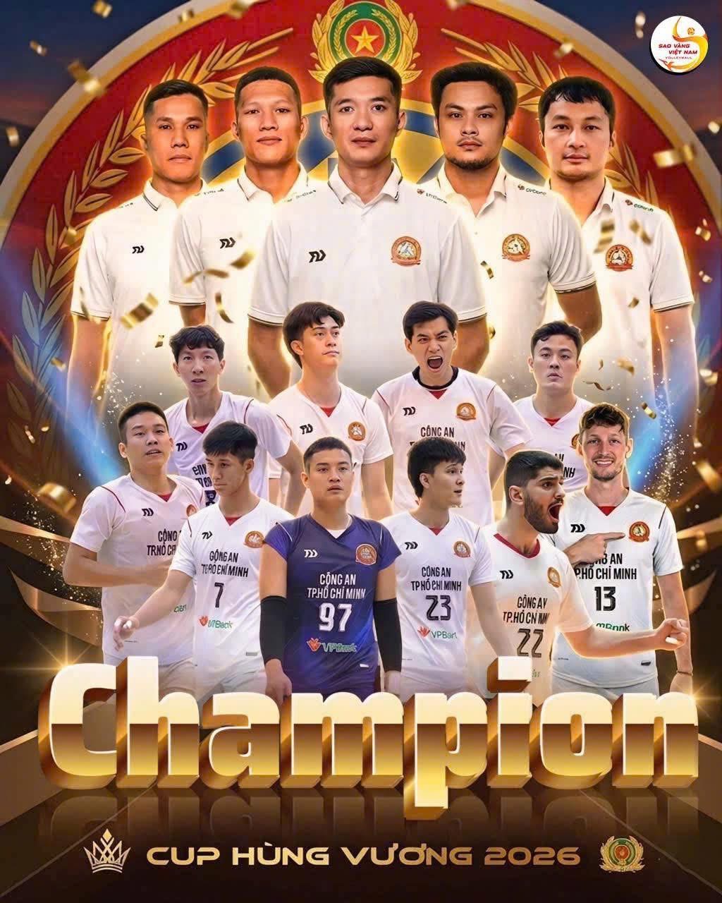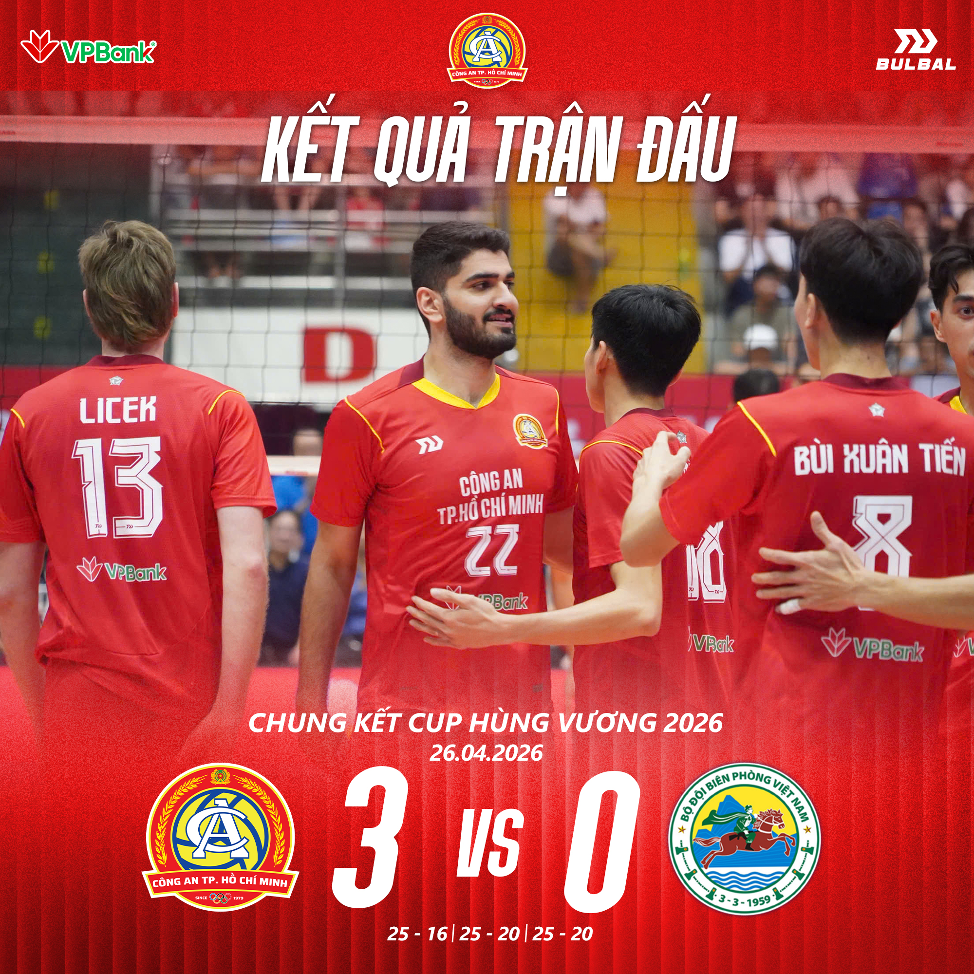 (CAO) Sau 4 ngày tranh tài với 8 trận đấu, giải bóng chuyền Cúp Hùng Vương 2026 vừa kết thúc vào khuya 26/4 (ngày Giỗ Tổ Hùng Vương 10/3 Âm lịch). Trận chung kết đã cống hiến cho người xem những màn tranh tài hấp dẫn, kịch tính, và đội Công an TPHCM đã xuất sắc giành chiến thắng 3-0 trước Biên Phòng MB, lên ngôi vô địch xứng đáng.
