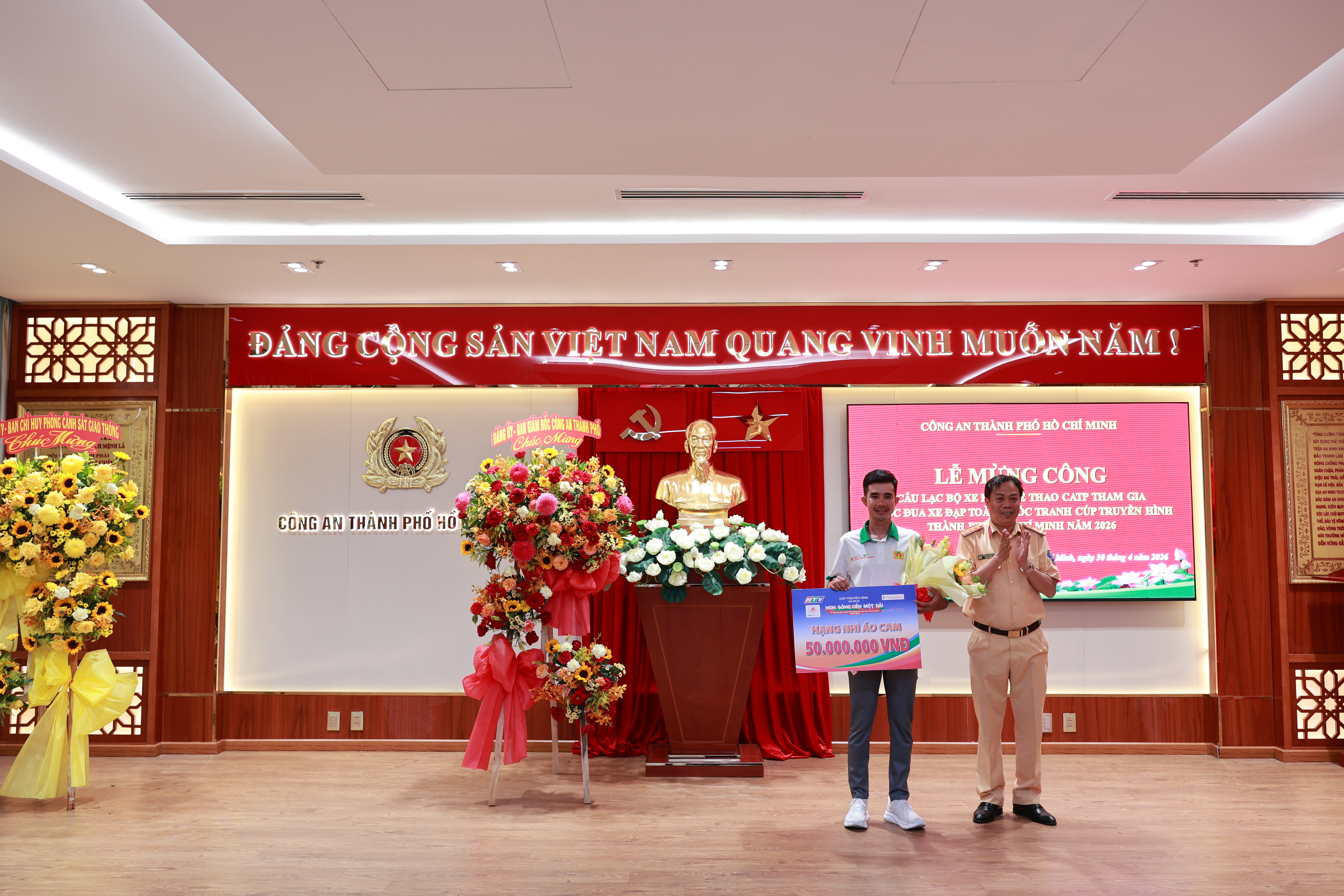 Đại tá Trần Trung Hiếu, Trưởng Phòng CSGT trao tặng hoa chúc mừng VĐV Nguyễn Hoàng Sang đạt thành tích Hạng nhì Áo cam chung cuộc